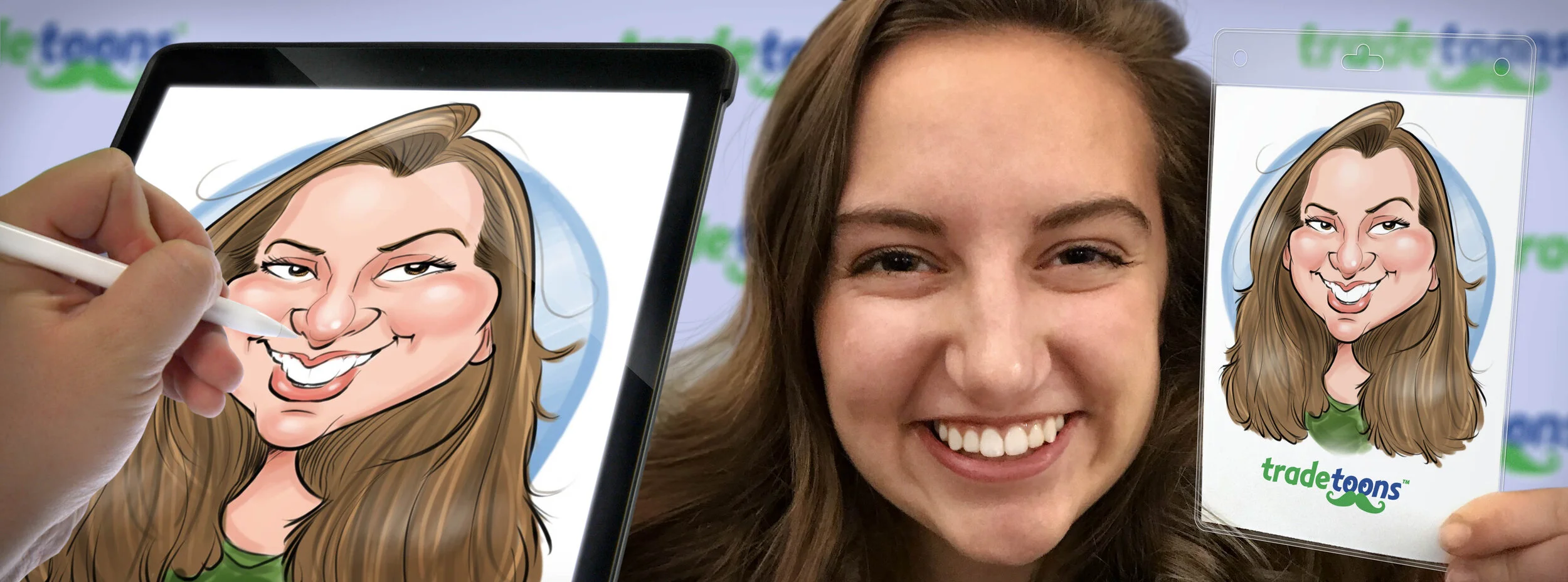 Since every face is unique, each live digital caricature from TradeToons™ is a truly personalized giveaway. And with your company logo printed on every digital cartoon portrait we draw, this giveaway is also purposeful since your trade show guests become walking billboards for your brand when they wear their caricatures in clear lanyard badges on the trade show floor. What other giveaway does that?